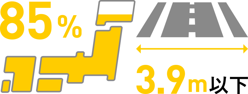 日本の道路の約85%は、道幅平均3.9m※の狭い市町村道。車幅1.48m以下の小さい軽自動車なら、市街地の路地や農道もスムーズに。対向車とのすれ違いも安心です。