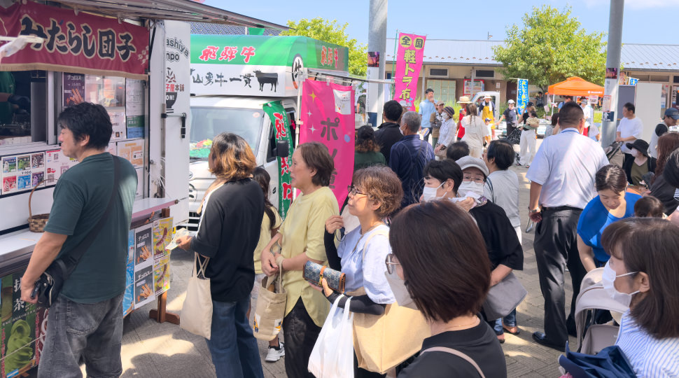 軽トラ市のゾーンには、全国から集まった軽トラが並び、さながら即席の商店街のよう。「軽トラ市」とは、軽トラックの荷台に地域の特産品や農産物、グルメ、雑貨などを陳列して即売するイベントで、日本各地で開催されています。全国から出店者が集まる「全国軽トラ市」がおよそ年に一度行われており、2025年は輪島市での開催となりました。