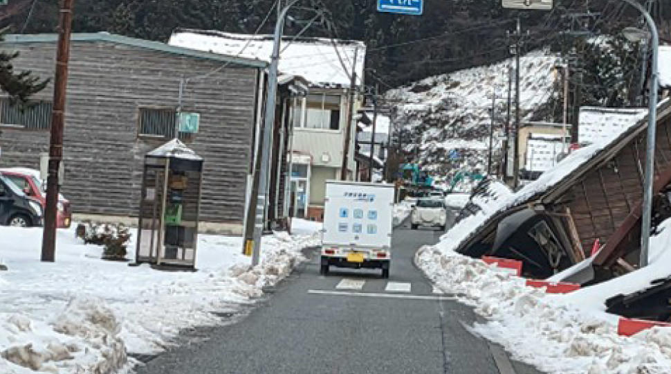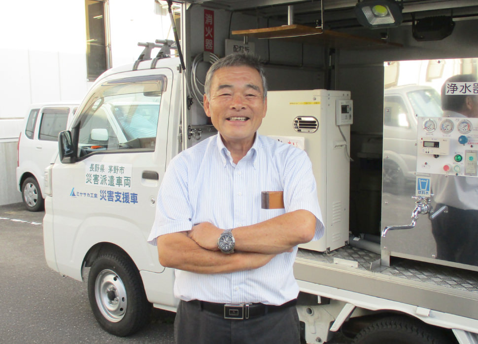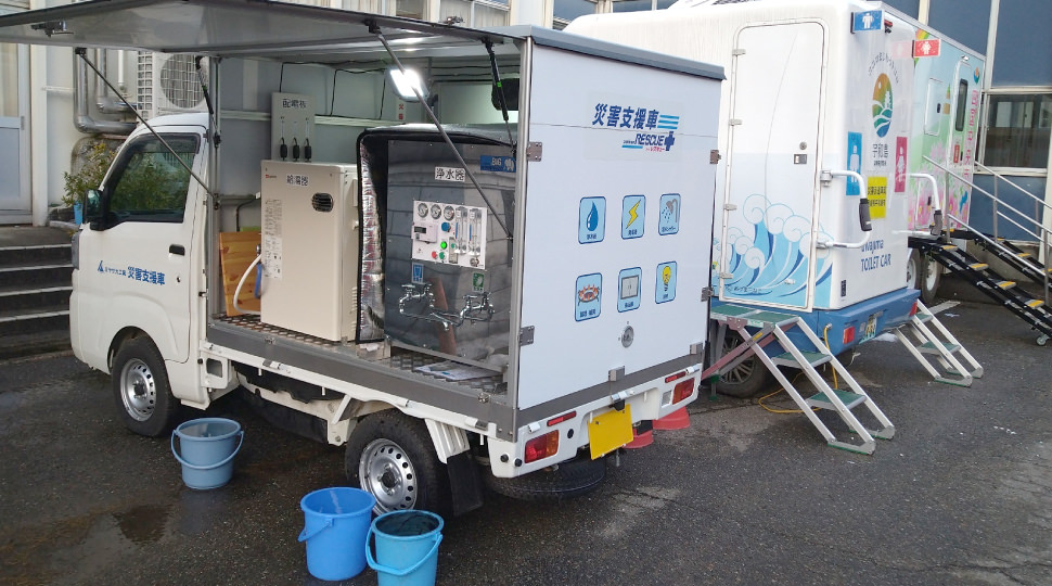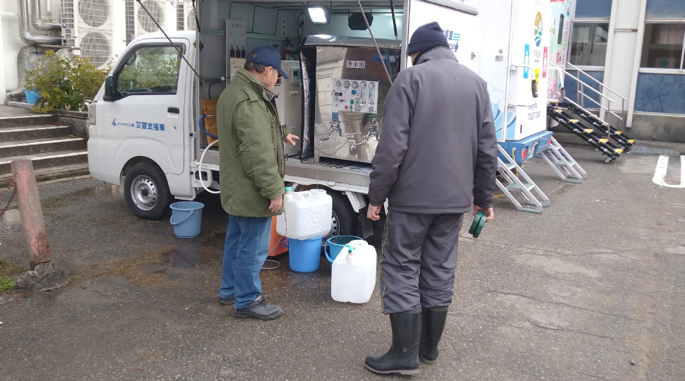 「災害が起きた当初は道路が半分崩落しているような箇所も多かったため、重機や大型トラックが入れない状況が続きました。ぬかるみにタイヤを取られつつも、四駆の軽トラは小回りが利くので、何とか移動し、被災地にまで到着することができました。まずは命をつなぐための飲み水が必要だというのはわかっていましたが、意外に喜ばれたのは給湯器から温水が出ること。寒さが厳しい時期の災害でしたから、体や手を洗うにも洗濯をするにも、温かいお湯があるというのはとても有効でした」と振り返ります。