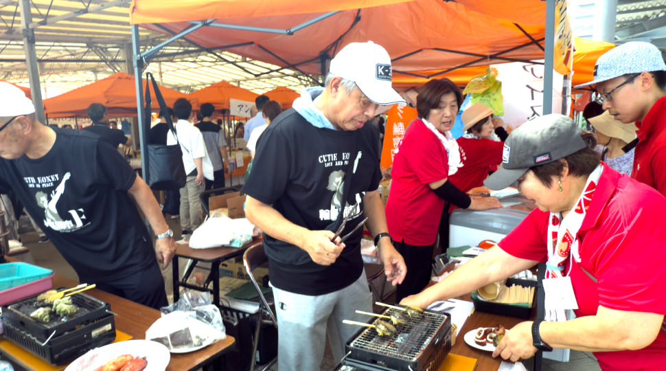 今回集まったのは、北は岩手県から南は宮崎県まで。それぞれの軽トラには、いい香りを漂わせるお茶や自慢のお米、パンパンに実ったぶどうやおおぶりの玉ねぎなどの農産物が並び、地元輪島のお客さんと話しながら、ふだんなかなか手に取ることができない地域の特産品を販売する様子が見られました。また、貴重な但馬牛を味わえる「ひとくちステーキ」や、噛めば噛むほどおいしい宮崎の「鶏の炭火焼き」は、その場で味わえるとあって行列ができる人気ぶり。